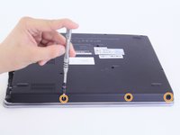 Use a Phillips #0 screwdriver to remove eight M2 × 3 mm screws near the front opening and scattered across the bottom of the laptop.