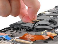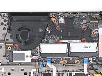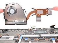 Grasp the fan and heatsink assembly by its edges and remove it from the laptop.