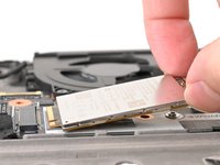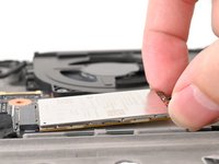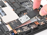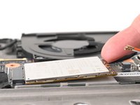 Use your fingernail or the flat end of a spudger to lift the edge of the SSD with a screw notch enough to grip it with your fingers.
