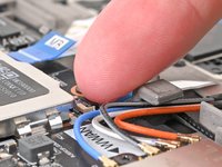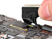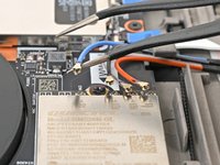 Insert an arm of your angled tweezers under the metal neck of one of the coaxial connectors on the Wi-Fi card and lift straight up to disconnect it.