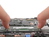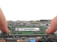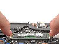 Use your fingers to simultaneously push the two metal tabs on the edges of the RAM module down and outwards to unlatch them—the RAM should pop up at a slight angle.