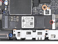 Use your fingernail or the flat end of a spudger to lift the edge of the SSD with a screw notch enough to grip it with your fingers.