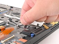 Lift one of the speakers off its post and guide the speaker cable out of its clips in the center of the laptop.