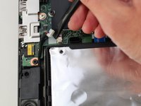 Using the black nylon spudger, remove the slide connector which attaches the left speaker to the motherboard.