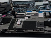 Use the iFixit Opening Tool to flip up the small locking flap on the trackpad's one ZIF ribbon cable connection. The ribbon cable should easily release from its socket.