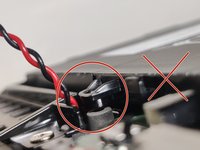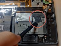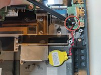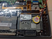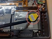 Remove the old adhesive pad underneath the CMOS battery. A spuger or pry tool may be helpful to scrap it off the chassis.
