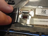 Next, locate the data cable to the right of the trackpad. Remove the cable from it's socket by Gently pulling the cable up and out of the socket.