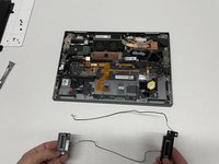 Starting at the top of the right speaker, follow the wire connected to the top of the left speaker. Use the tip of a spudger to free the wire from the plastic brackets it lies under.