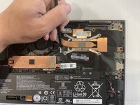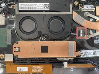 Use a Phillips #1 screwdriver to remove the two 2.2 mm screws securing the copper plate over the SSD.