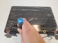 Loosen the four 9.7 mm screws on the hinges in the top left and right corners using a Phillips #0 screwdriver.