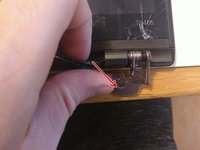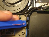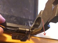 Take the prying tool and carefully lift the metal clip on the flat connector above the right hinge.