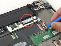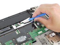 Using the same plastic opening tool, flip up the locking tab and disconnect the trackpad cable from the motherboard.