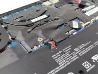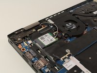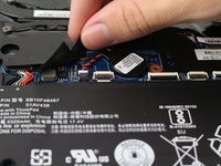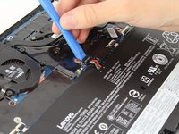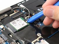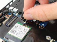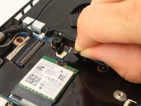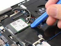 Carefully disconnect the gray and black antenna connectors on the green wireless LAN card by lifting under the antennas with an opening tool.