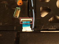 The trackpad ribbon wire in blue, unhinge the clamp to release the blue ribbon wire.