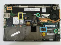Ease the antenna cables for the wifi and 3G out of their black holder, and pull the holder off the motherboard towards the top side of the laptop. This is marked in yellow.