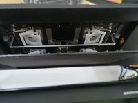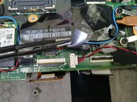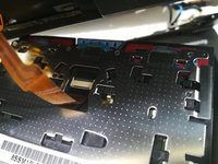 Then ease up the two connectors, one underneath the large connector just removed. These are done by raising the black tab on the connector to vertical then pulling gently on the ribbon cable. These are marked in orange in the photo.