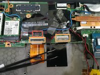 Remove the motherboard by easing it to the right from under a tab marked in blue near the BIOS battery, and gently placing it back towards the top of the laptop.