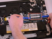 Use your fingers or two of the blue Opening Tools to lightly pull the tabs away from the RAM to free the first stick.