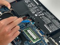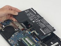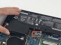 Gently lift the battery and use the plastic opening tool to remove the battery's connection to the laptop.