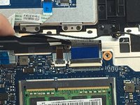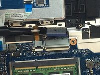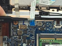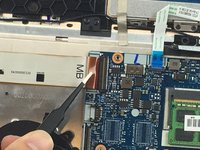 Gently lift the clip holding down the blue ribbon connection the touch pad to the motherboard. Use tweezers to disconnect the ribbon.