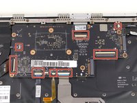 Using the pointed end of a spudger, flip up the hinged locking tabs of the eight ZIF connectors on the motherboard.