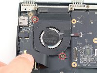 Remove the two 3.6 mm screws from the left fan with a Phillips #00 screwdriver.