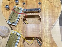 • Flip over your guitar again. Thread the wire of the new pickup through the body to the control cavity and screw in the pickup using the Phillips #0 screwdriver.