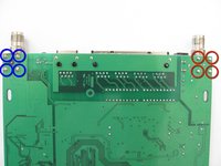 The solder connections shown in blue hold the left antenna port in place. Desolder these 4 points to remove the antenna port.