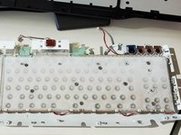 Using a smaller or jeweler size screw driver, remove the 12 smaller silver Philips head screws (circled in orange in the pictures) that hold the light and key panel to the motherboard.