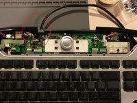 Remove the three silver Philips head screws (circled in blue in the pictures) holding the control pad and light button pad against the motherboard and set them aside.