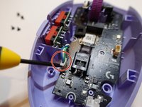 Use a 1.5 mm flathead screwdriver to remove the four mouse skates from the bottom of the mouse.