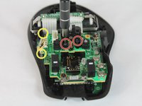 If you have modded your mouse to use socket instead of soldered connections, lift the board up from the locations indicated by the yellow circles to avoid breaking the PCB. When reassembling, first align the two center posts that the scroll wheel mount attaches to the holes, then press down on the header area.