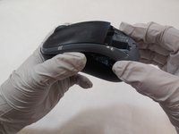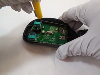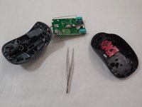 Using the tweezers, gently pull the circuit board from the mouse. Hold the circuit board by the metal frame that surrounds it, as shown.