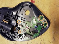 After the screws are loosened, the housing can be easily removed. The space for the blue ball is made of its own piece of plastic. The circuit board is held in place with a few screws.