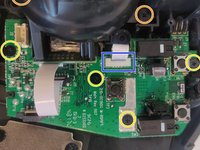 Unplug the flex ribbon indicated in blue, coming from the power board below. Remove the six screws holding the main motherboard (one indicated orange here, just out of shot).