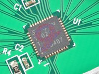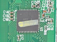 • A Nordic Semiconductor RF24LU1 transceiver is attached to the top of the board. This chip is responsible for receiving and transmitting signals with the wireless keyboard.