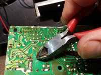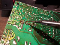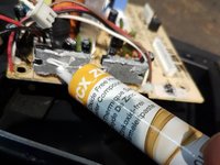 With the soldering iron solder the spare capacitor to the main board with the negative terminal in the same hole as the previous capacitor.