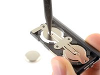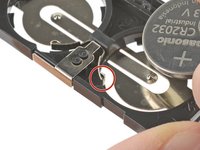 Press one edge of a CR2032 coin cell battery against the contact arm, its text and "+" sign facing up.