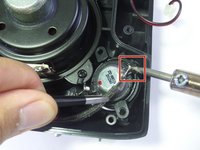 Simultaneously unsolder the thin silver connecting wire using soldering iron while lifting tweeter speaker away from device using flat-head tweezers.