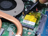 Remove the WIFI card by disconnecting the two coax cables and removing the retaining screw.