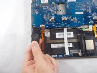Disconnect the wires connnecting the speaker to the motherboard by grasping the portion of the cable covered in black shielding, and carefully pulling it horizontally away from the port it is connected to.