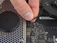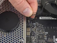 Remove the two 11.3 mm T6 Torx screws securing the fan to the logic board near the antenna plate.