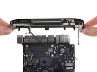 Beneath the speaker, we find some antenna cables, but unfortunately no modular AirPort card—in what is becoming a trend, these are socketed right to the main board.