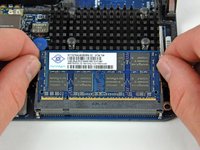 Simultaneously pull the tabs on each side of the RAM chip away from the center of the chip. These tabs lock the chip in place and releasing them will cause the chip to "pop" up.