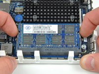 Simultaneously pull the tabs on each side of the RAM chip away from the center of the chip. These tabs lock the chip in place and releasing them will cause the chip to "pop" up.