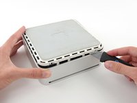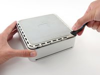 Once you have the first side free, rotate the Mac mini and start prying up on the front edge.