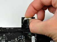 Push the PRAM battery toward the center of the logic board and pull it up out of its holder. You'll have to push the battery in further than you'd expect in order to get it to pop free.