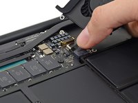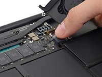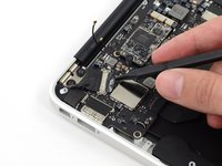 Use the flat end of a spudger to pry both short sides of the battery connector upward to disconnect it from its socket on the logic board.