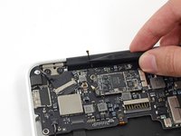 Gently lift the logic board assembly from the heat sink end and pull it away from the port side of the case to remove it from the Air.