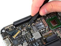Use the flat end of a spudger to pry both short sides of the battery connector upward to disconnect it from its socket on the logic board.